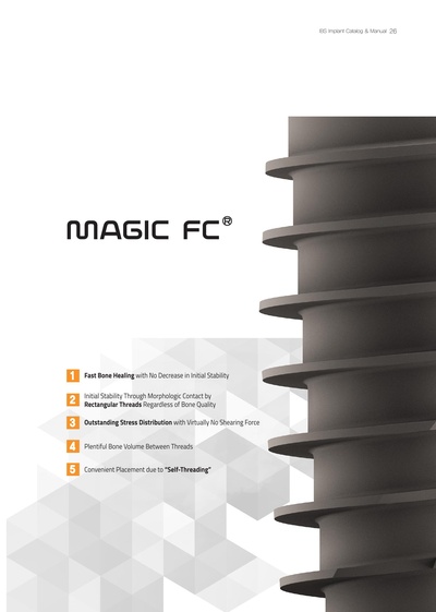 Magic FC — дентальный имплант от IBS Implant (Innobiosurg). Устанавливается на костный уровень. Соединение внутреннее, шестигранное по форме. Конструкция: тело коническое, резьба V-образная, апекс куполообразный. Линейка из 30 артикулов в 8 диаметрах и 4 длинах — все варианты см. в таблице размеров ниже. Для установки используется отвёртка Hexagon 1.20mm.